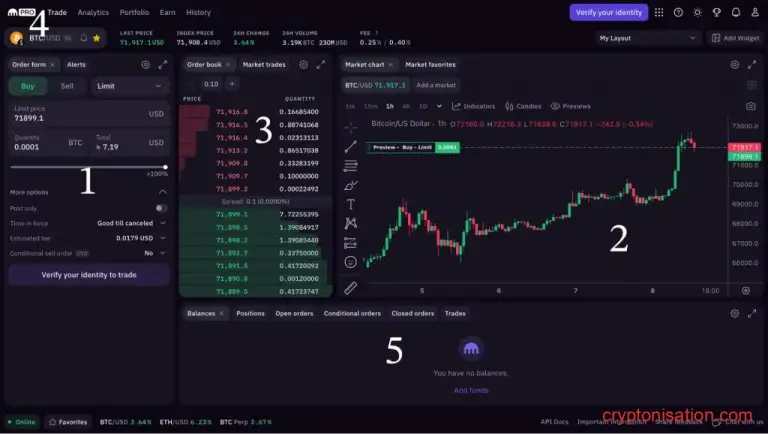 Терминал для торговли доступен в режиме Kraken Pro. Здесь можно проводить сделки на покупку или продажу криптовалюты, выставлять ордера и проводить технический анализ. Давайте рассмотрим инструменты терминала более подробно: