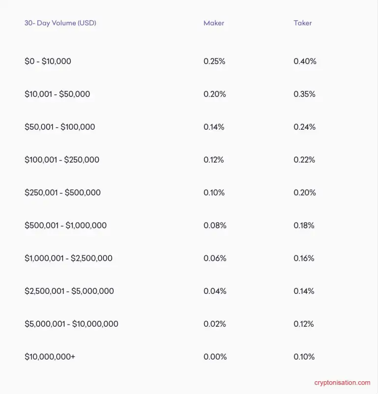 - Высокие комиссии для мейкеров и тейкеров на споте при небольших объемах. Базовая комиссия на спотовом рынке превышает 0.1%, что является выше средних показателей по рынку;