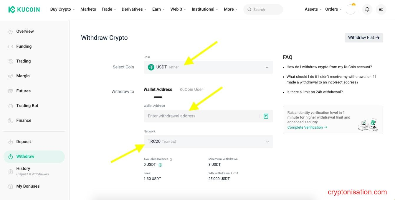 Чтобы вывести USDT с биржевого баланса, выполните следующие шаги: