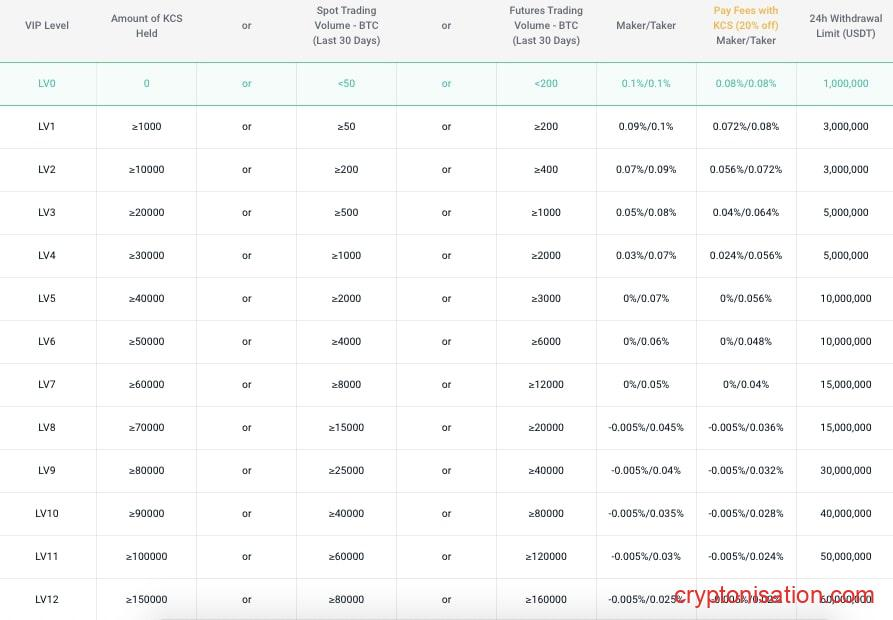 Снижение комиссий на бирже KuCoin возможно путем повышения уровня VIP, предоставляющего различные привилегии. Уровень (от LV0 до LV12) зависит от торговых оборотов за 30 дней на спотовом рынке или рынке деривативов, или количества удерживаемых на балансе монет KCS. Кроме того, пользователи получают дополнительную скидку 20% при оплате комиссий внутренней валютой KCS.