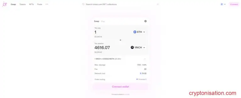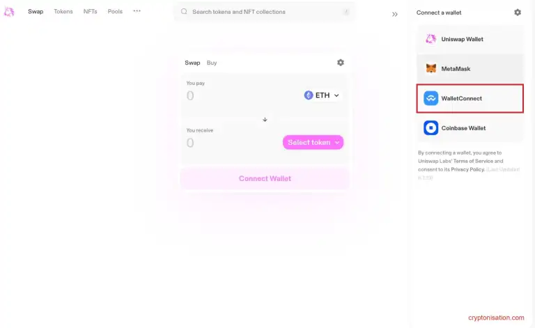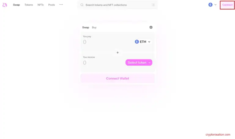 - Активируйте вкладку Swap и подключите криптовалютный кошелек к Uniswap;