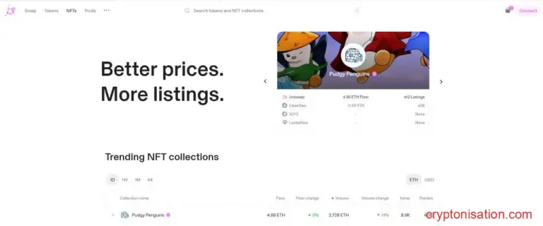 Раздел NFT представляет собой маркетплейс-агрегатор NFT.На странице представлены различные коллекции невзаимозаменяемых токенов с ценами в ETH и USD. При клике по названию коллекции открывается страница с подробным описанием коллекции, официальными ссылками и кнопками покупки и продажи токенов.