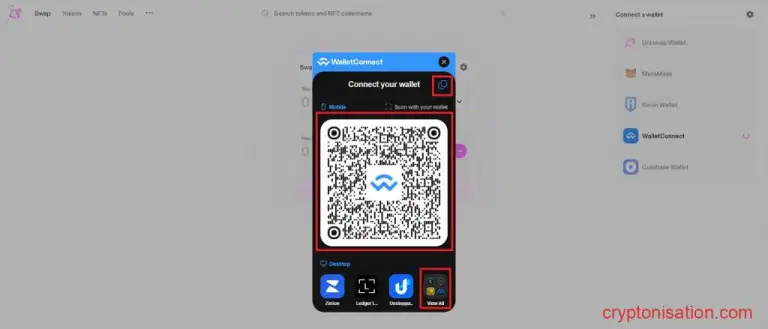 Cписок доступных для подключения кошельков - Отсканируйте QR-код, скопируйте ссылку для подключения или выберите нужный кошелек, кликнув View All;