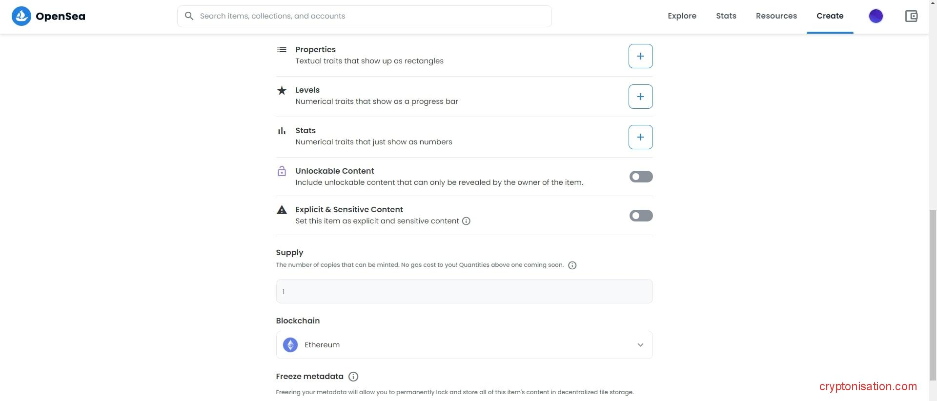 Создание нового NFT-токена - Supply / Поддержка — определяет количество токенов, которые будут минтиться. Пока это число на OpenSea ограничено единицей 🙁;