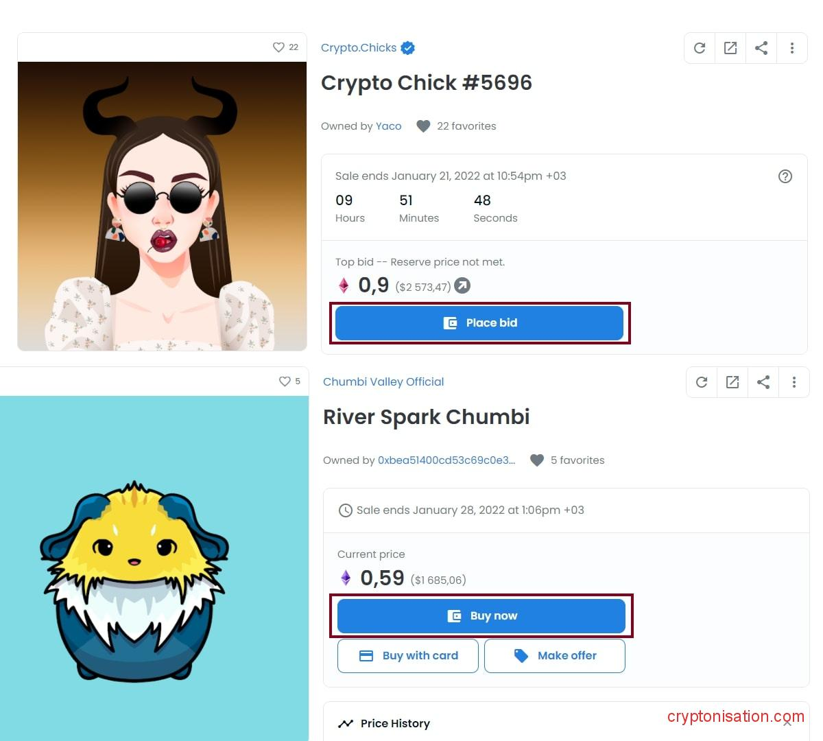 Страница NFT-токена - Чтобы купить токен, нужно нажать Place Bid / Сделать ставку или Buy Now / Купить сейчас;