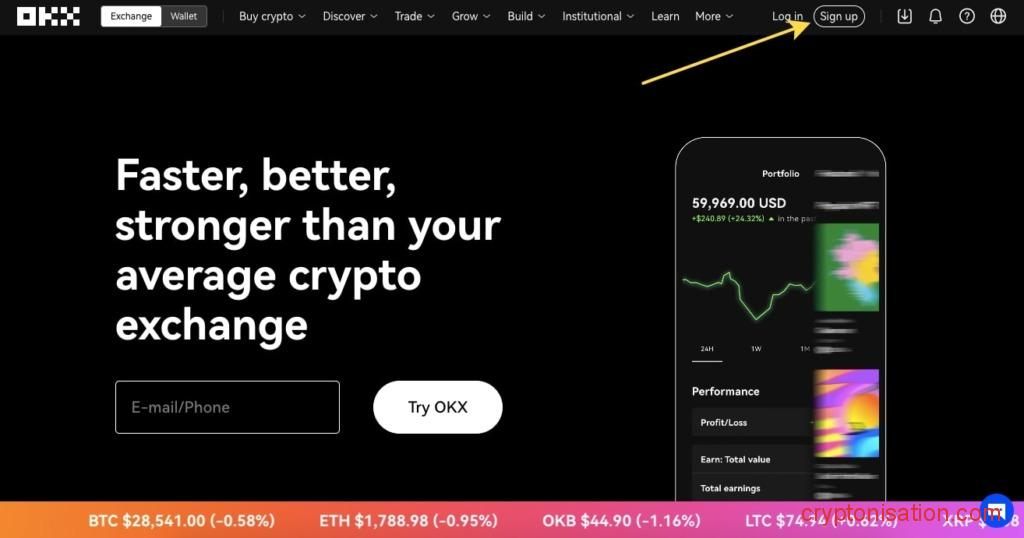 - Visita el 👉 sitio web oficial de OKX y haz clic en el botón Sign up de la página de inicio;