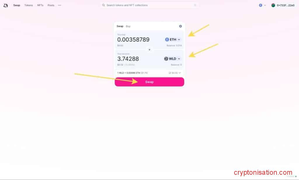 Conexión del monedero - En la sección Swap, especifica la dirección del intercambio: das ETH (u otro token) y recibes Worldcoin;