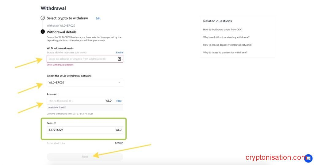 - Introduce la cantidad de Worldcoin que deseas retirar del exchange;