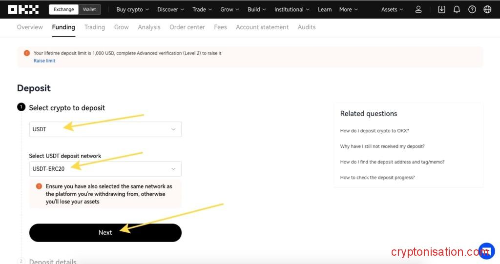 Para comprar la criptomoneda Worldcoin en 👉 OKX, tendrás que hacer un depósito. El par WLD/USDT está disponible en el mercado al contado del exchange, así que vamos a poner USDT stablecoin en la cuenta.