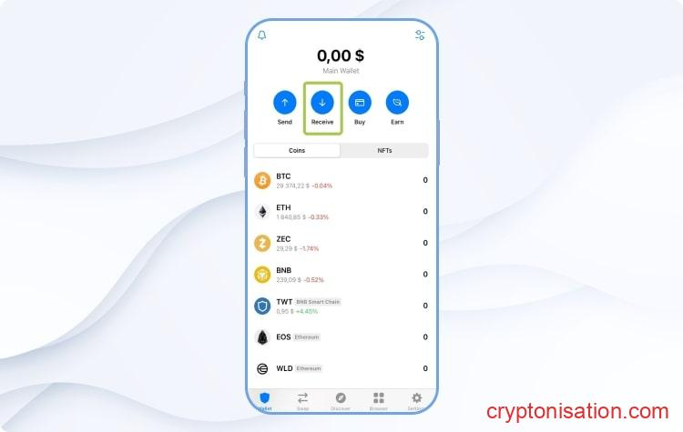 - En la aplicación Trust Wallet, en la página de inicio, selecciona Receive;