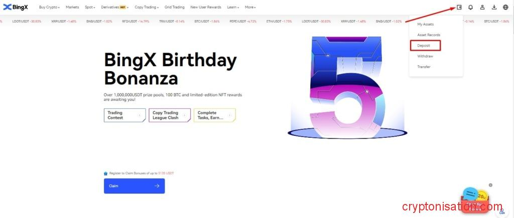 - Inicia sesión en tu cuenta de BingX, haz clic en el icono de la billetera en el panel de control y selecciona Deposit;