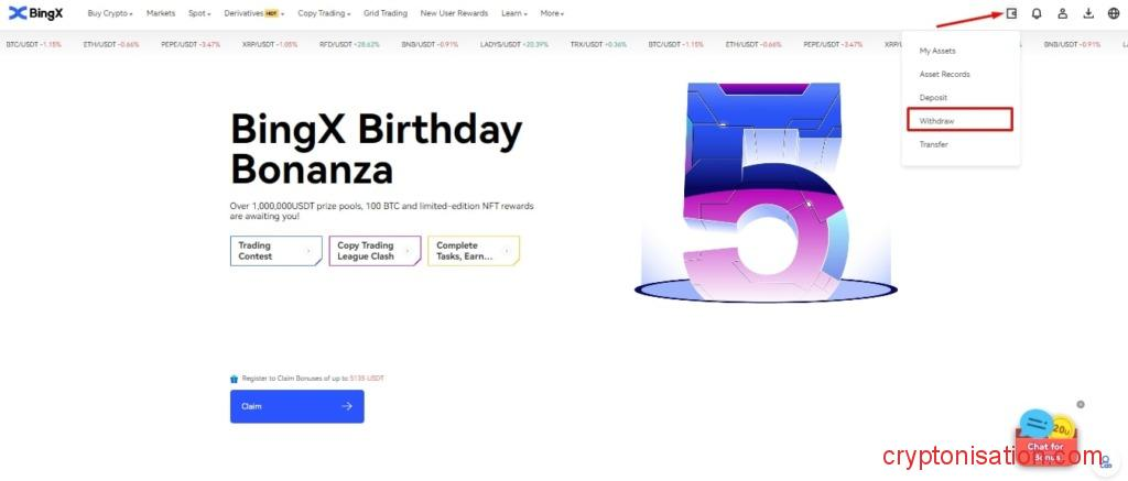 - Inicia sesión en tu cuenta BingX, haz clic en el icono de la billetera y, a continuación, en Withdraw;