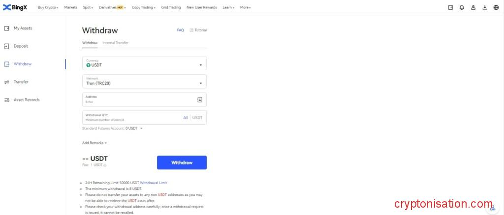 - Selecciona la moneda que quieres retirar (por ejemplo USDT), especifica la red (por ejemplo TRC20), introduce la dirección que tienes en tu billetera, especifica la cantidad de monedas que quieres retirar y haz clic en Withdraw. Asegúrate de que las redes de la billetera y del exchange coinciden.