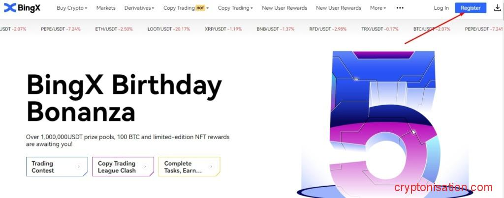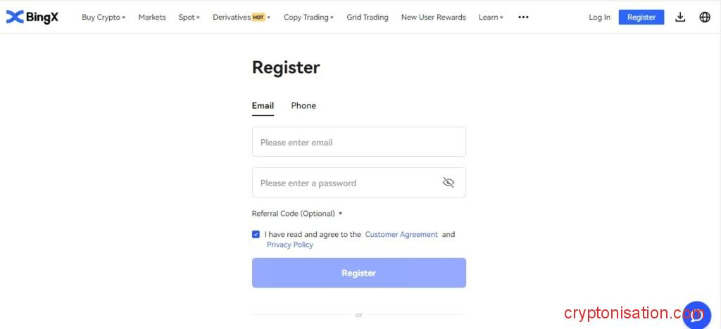 - Visita 👉 la página oficial de BingX y haz clic en Log in/Register en la esquina superior derecha;