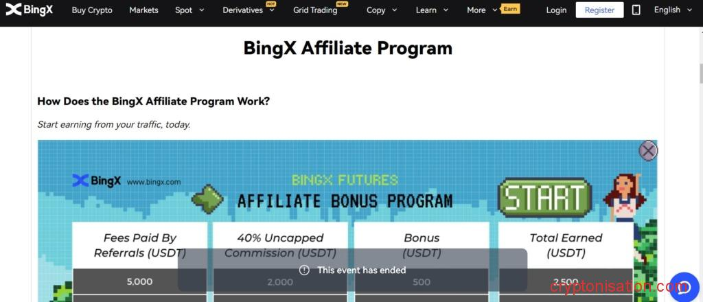 Los usuarios que han invitado a otros usuarios a registrarse en el exchange a través de un enlace de referencia único, reciben recompensas por participar en el programa de afiliación de BingX. Los socios reciben ingresos pasivos por cada transacción realizada por los invitados en el mercado spot o de futuros.