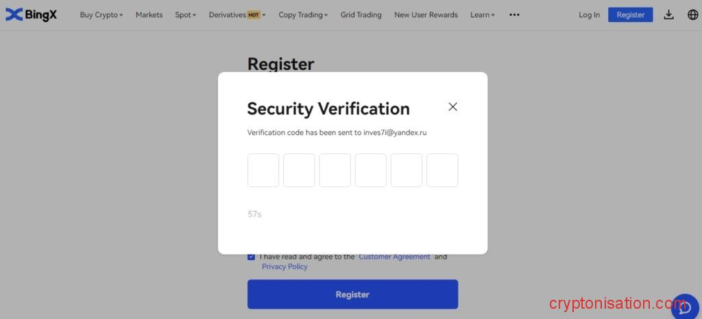 El proceso de registro en BingX es rápido y sencillo. Todo lo que necesitas es un correo electrónico, una contraseña y un código de verificación de correo electrónico. El KYC no es un requisito obligatorio para depositar y operar con criptomonedas, pero para retirar más dinero, debes pasar por el proceso de verificación.