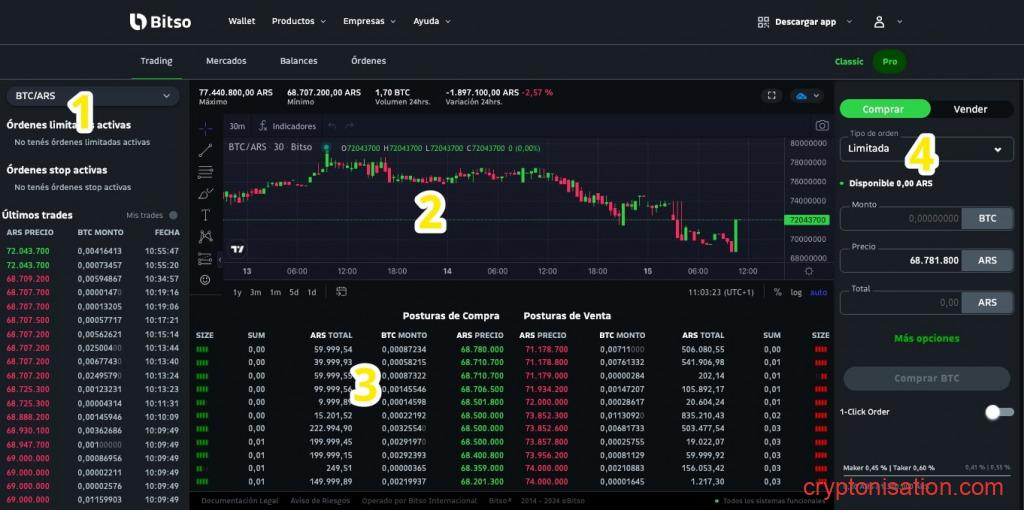 La interfaz de trading de 👉 Bitso incluye las siguientes secciones:
