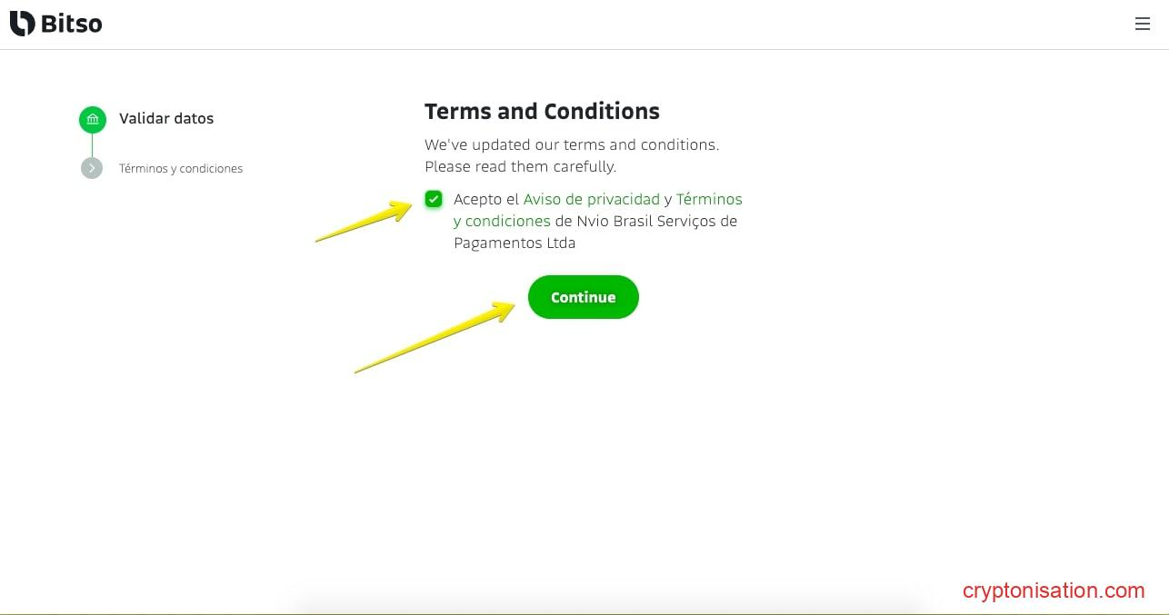 - Acepta los términos y condiciones de la plataforma y pulsa Continue.
