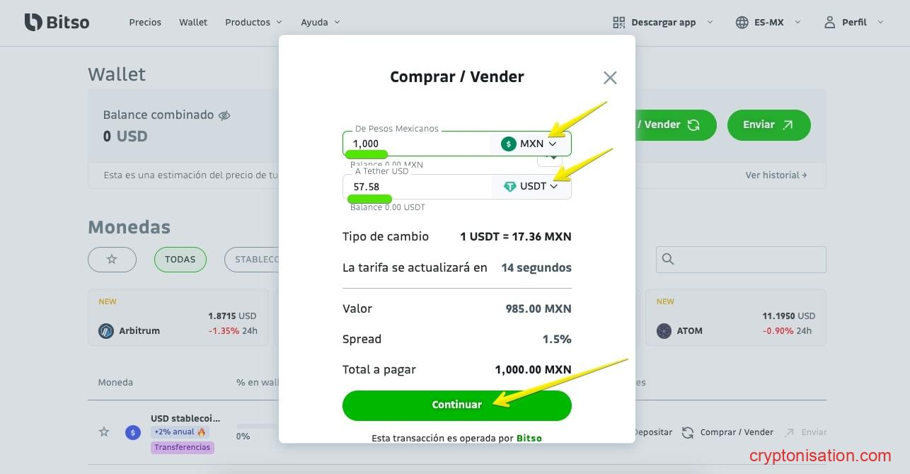 Comprar/vender - Ahora indica la divisa que vas a utilizar para comprar (MXN) y la divisa que quieres comprar (USDT).