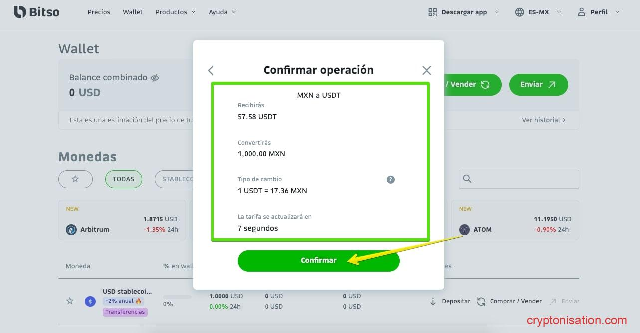 - Introduce la cantidad en MXN: el sistema calculará automáticamente cuántos USDT recibirás.