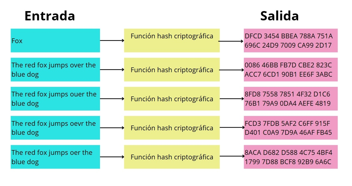 Cabe destacar la propiedad del efecto avalancha. Gracias a esta propiedad, el más mínimo cambio en los datos de entrada provoca cambios significativos en el resultado del hashing. Por ejemplo, si cambiamos un solo carácter de la cadena, el resultado del hashing cambiará drásticamente.
