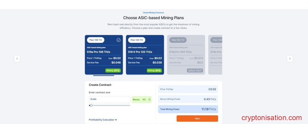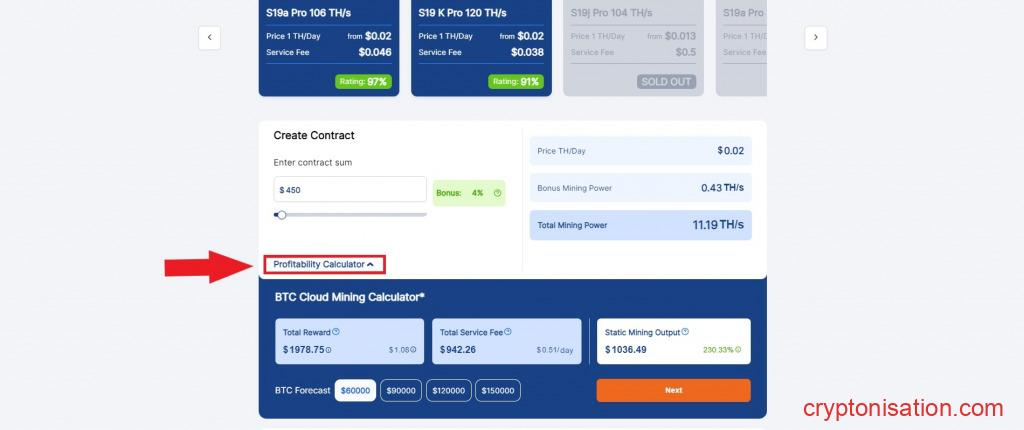 Para calcular la rentabilidad en cada caso concreto, puedes utilizar la calculadora de rentabilidad de la web de la empresa. La calculadora aparece haciendo clic en la línea Profitability Calculator del menú Buy Hashrate en la cuenta personal, y también está disponible en la página principal del servicio en Cloud Mining Choose → ASIC-based Mining Plans.