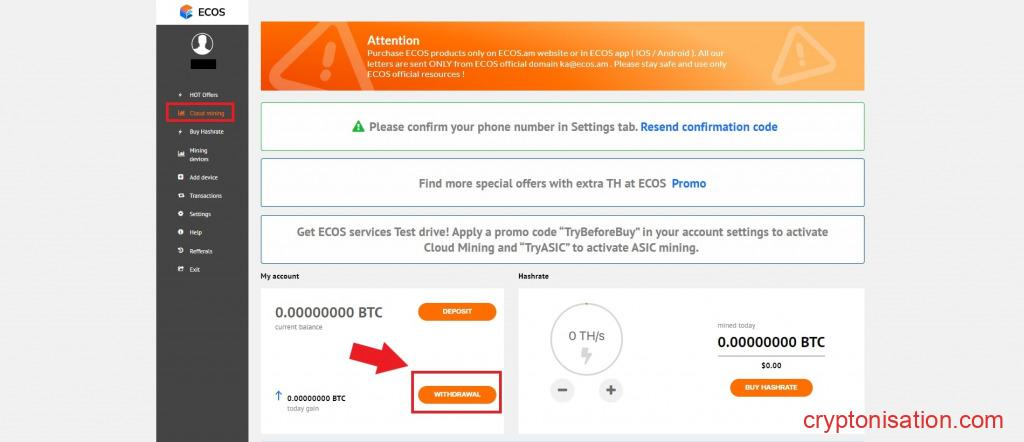 - Ve a tu cuenta personal → haz clic en Cloud Mining en el menú vertical → haz clic en Withdrawal;