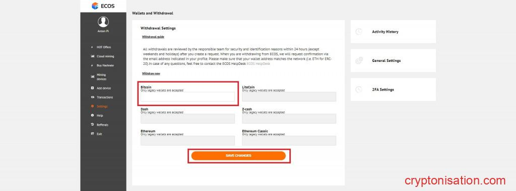 Botón Withdrawal en la cuenta personal - Ingresa la dirección BTC para retirar fondos → Save Changes;