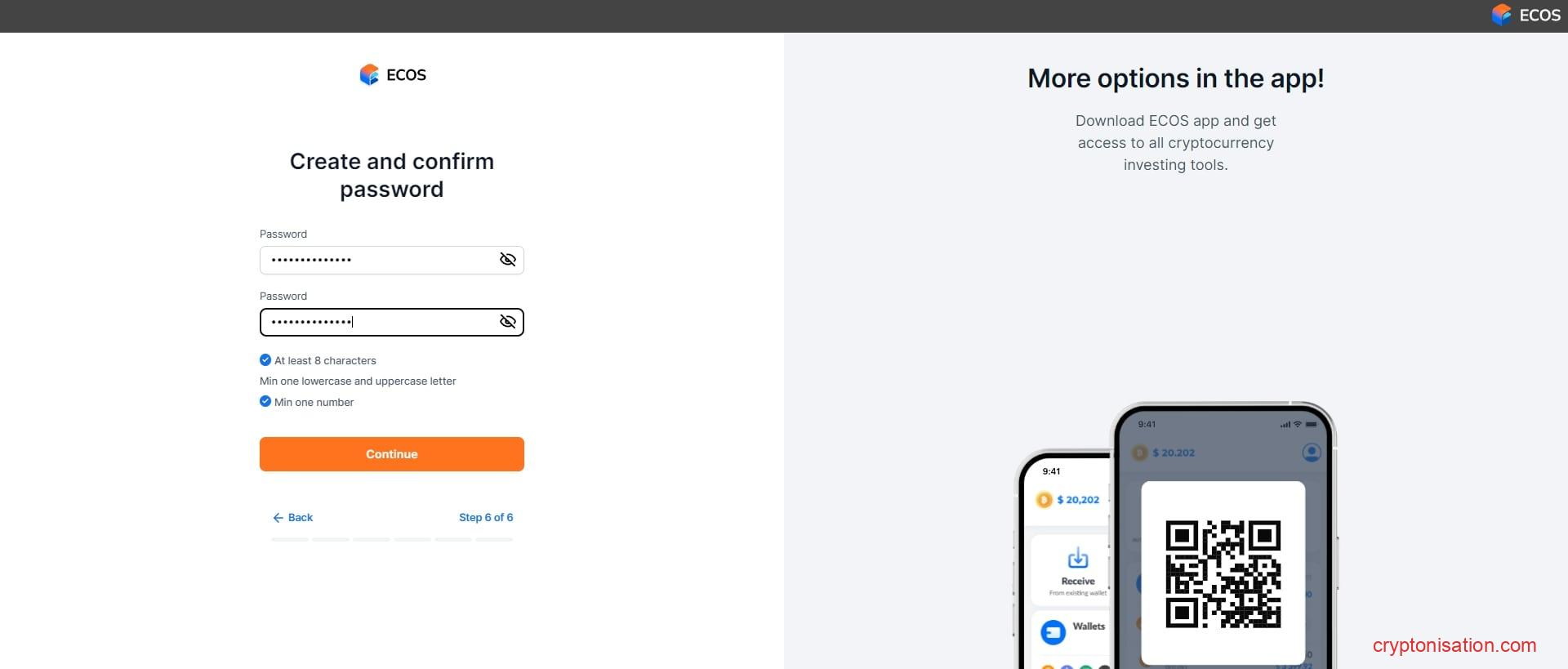 Página para introducir el número de teléfono - Crea una contraseña e insértela en ambos campos → haz clic en Continue;