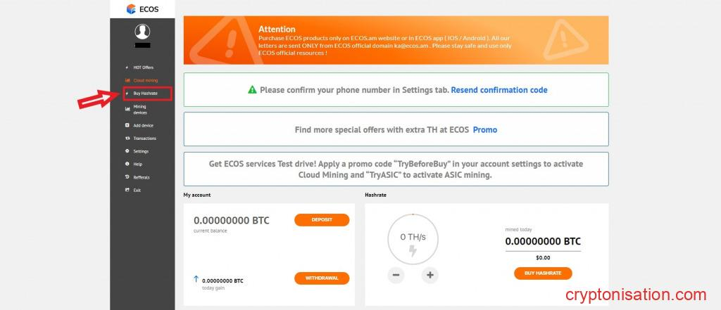 Para poder empezar a minar en ECOS Cloud Mining, debes registrar una cuenta de usuario y comprar cualquiera de los contratos disponibles. Echemos un vistazo más en profundidad a estos procesos.