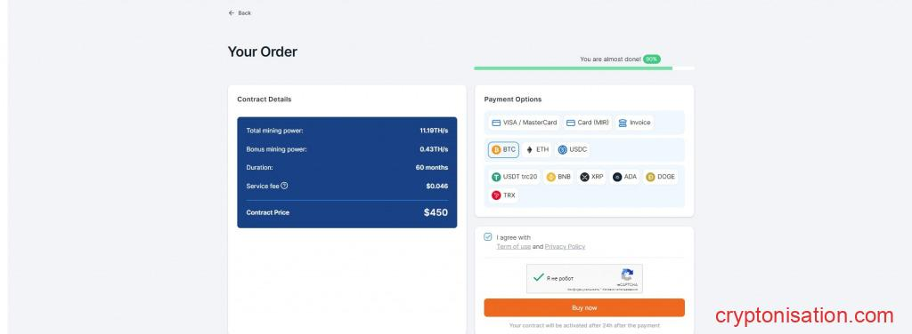 - Es necesario calcular el coste final del servicio del contrato por cuenta propia. Para calcular el coste final del servicio del contrato en TH/s es necesario realizar los cálculos por cuenta propia. En la descripción del contrato solo se indica el coste por 1 TH/s al día. La calculadora de rendimiento tampoco muestra el coste del servicio del contrato en función de la cantidad comprada de TH/s (se utiliza una fórmula compleja para calcular el rendimiento);