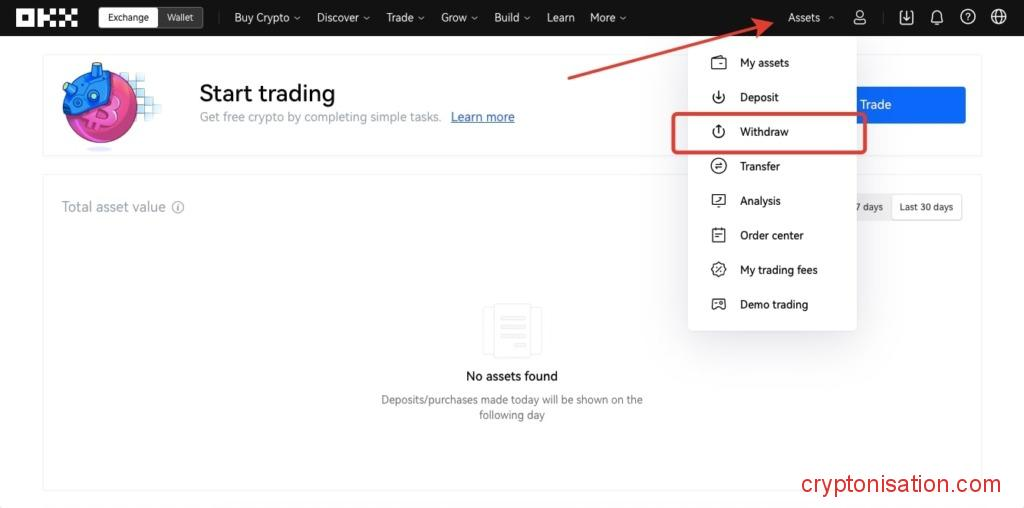 - Зайдите в личный аккаунт на бирже и в верхнем меню выберите Assets → Withdraw;