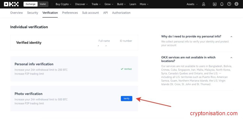 Верификация на OKX - Укажите желаемый уровень верификации → кликните Verify и выполните требуемые действия.