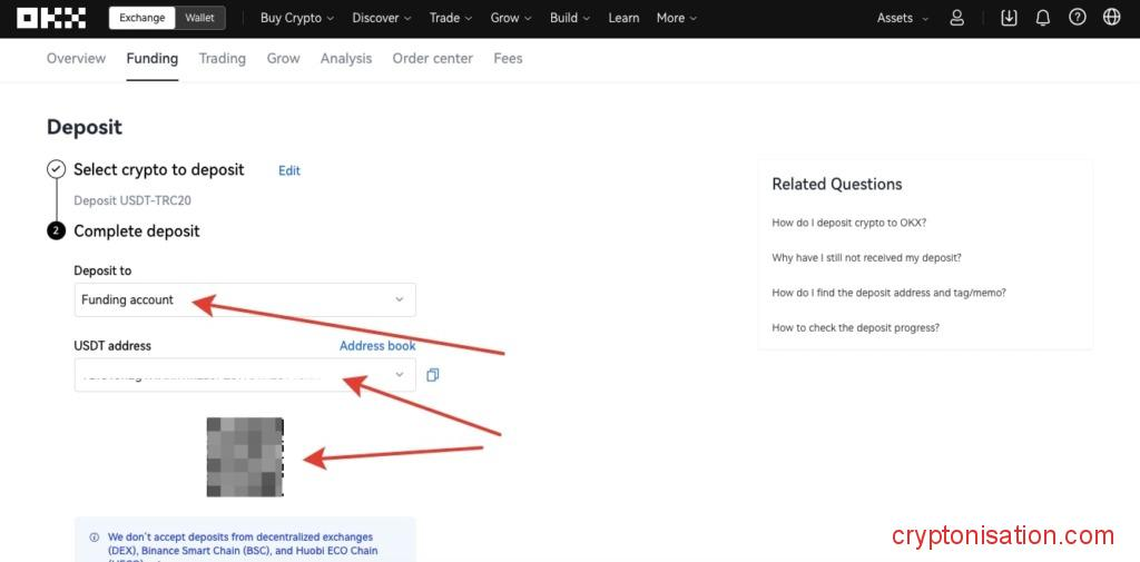 Депозит на OKX - Укажите валюту пополнения (в нашем случае это USDT) и сеть. Убедитесь, что сеть в вашем кошельке и на бирже совпадают (например, мы указали сеть TRC-20);