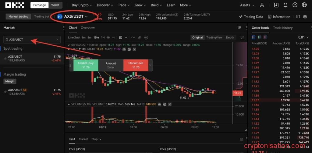 Торговля на спотовом рынке OKX - В открывшемся торговом терминале укажите пару (в нашем случае это AXS/USDT);