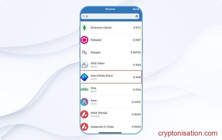 Кнопка Receive в Trust Wallet - Из списка поддерживаемых кошельком монет выберите AXS;