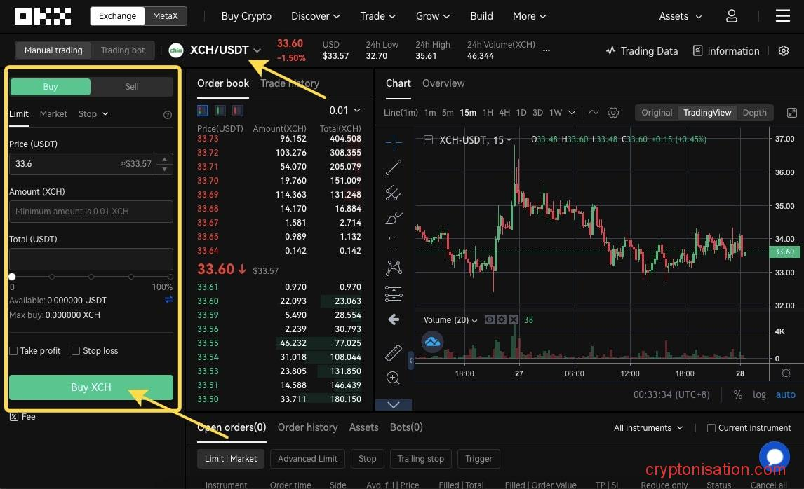 - Слева указываем криптопару XCH/USDT;