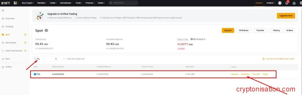 Вывод активов со спотового кошелька Байбит - Выберите монету (например, FIL) и нажмите Withdraw;