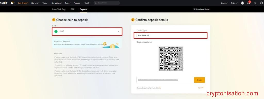 Получение адреса для пополнения депозита - Вставьте скопированный адрес в кошелек-отправитель;