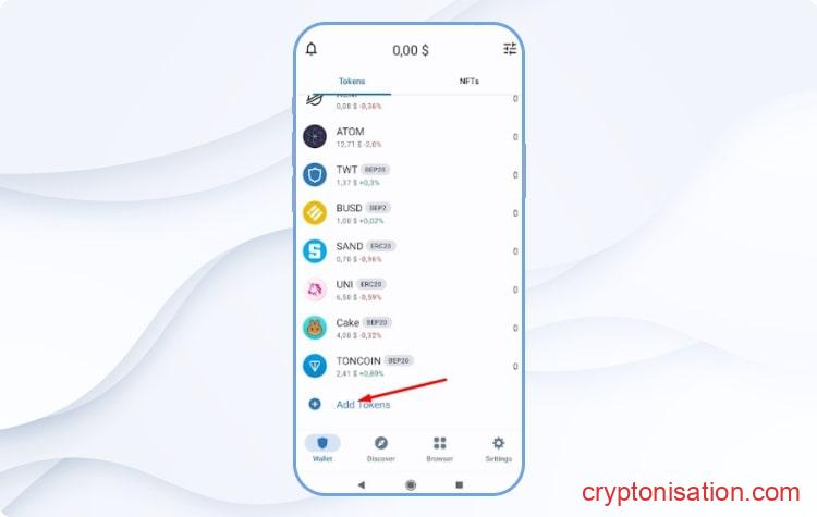 Заполнение информации для вывода средств - Чтобы получить адрес кошелька, откройте приложение (в данном случае Trust Wallet) и нажмите Add Tokens (если не найдете монеты в открывшемся списке);