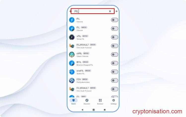 Добавление FIL - Введите название монеты в появившейся строке поиска;