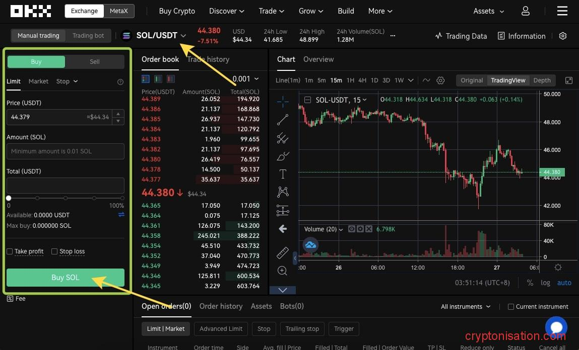 На примере криптобиржи OKX (OKEX), занимающей топовые позиции по торговым оборотам, совершим покупку Solana за USDT.