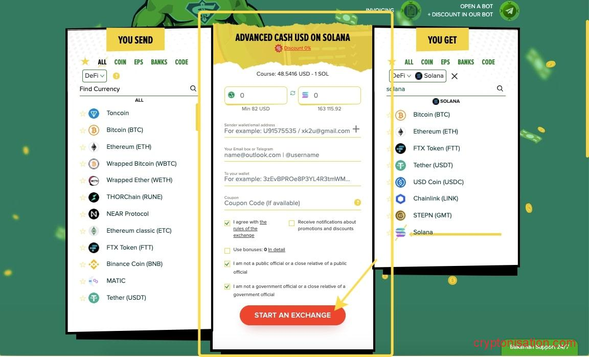 Рассмотрим и другие проверенные способы покупки или продажи Solana. Кроме криптобирж, для этой цели можно использовать онлайн-обменники. ✅