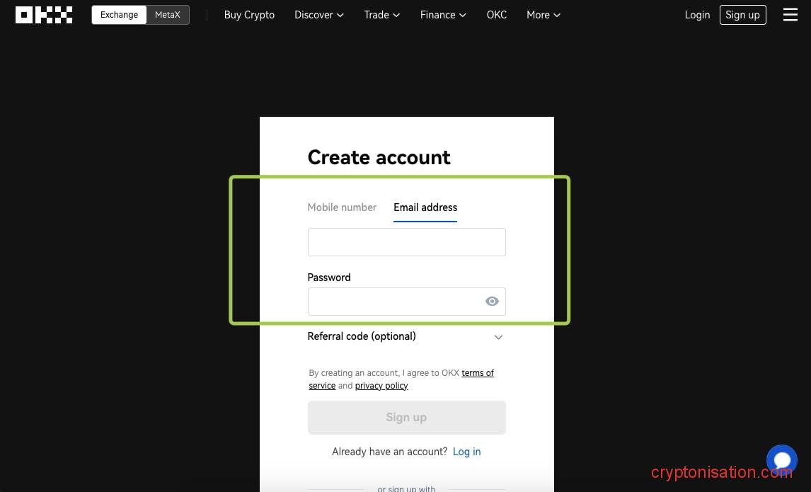 Начало регистрации на OKX - Заполняем форму регистрации: указываем адрес электронной почты (или номер телефона);