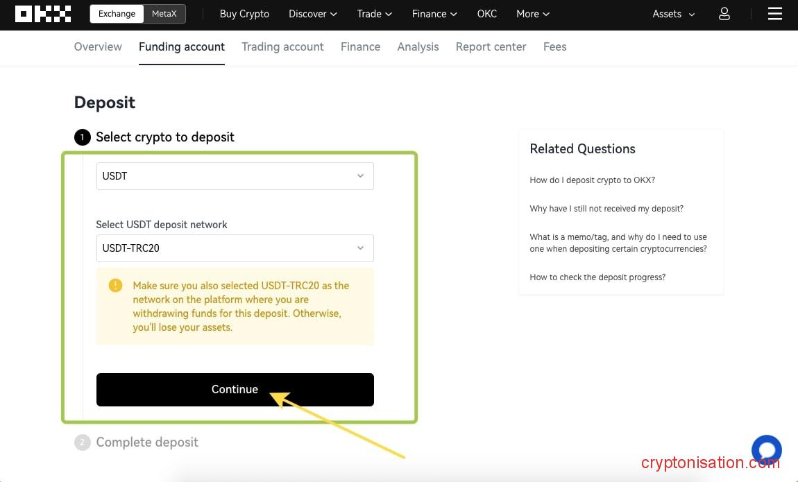 - Находим криптовалюту, которую собираемся зачислить на счет (например, USDT), и указываем сеть для перевода → Continue;