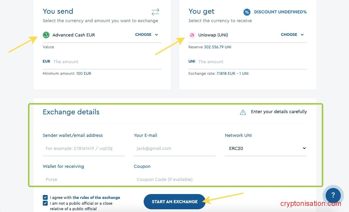 - Выбираем валюту покупки и валюту продажи (например, Advanced Cash EUR и UNI) → заполняем форму Exchange details→ жмем Start an Exchange.