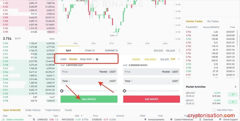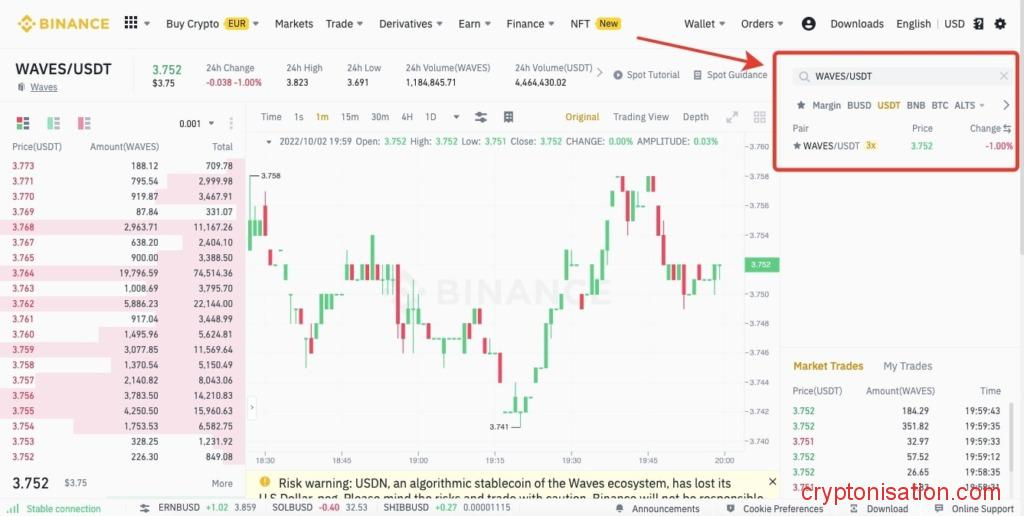 Торговля на спотовом рынке Binance - Укажите торговую пару (в нашем случае это WAVES/USDT);