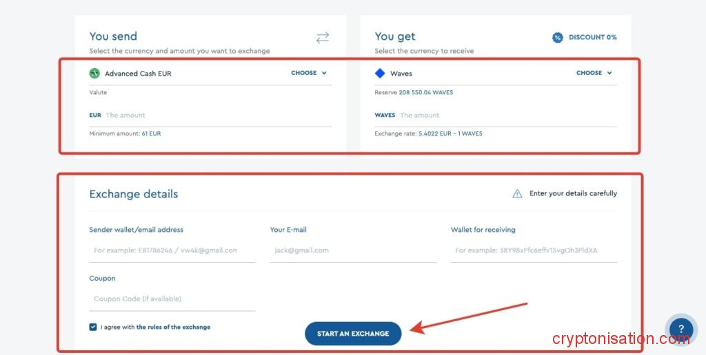 - В графе You send укажите способ оплаты (например, Advanced Cash EUR), в графе You get — WAVES;