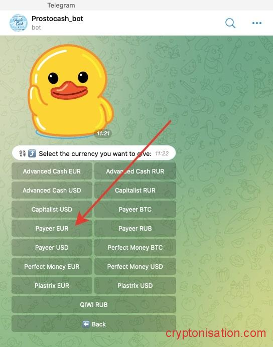 Начало обмена с помощью бота - Выберите способ оплаты из предлагаемых сервисом (криптовалюта, платежные системы, банки, чеки). Затем выберите конкретную валюту, например, Payment systems → Advanced Cash EUR;
