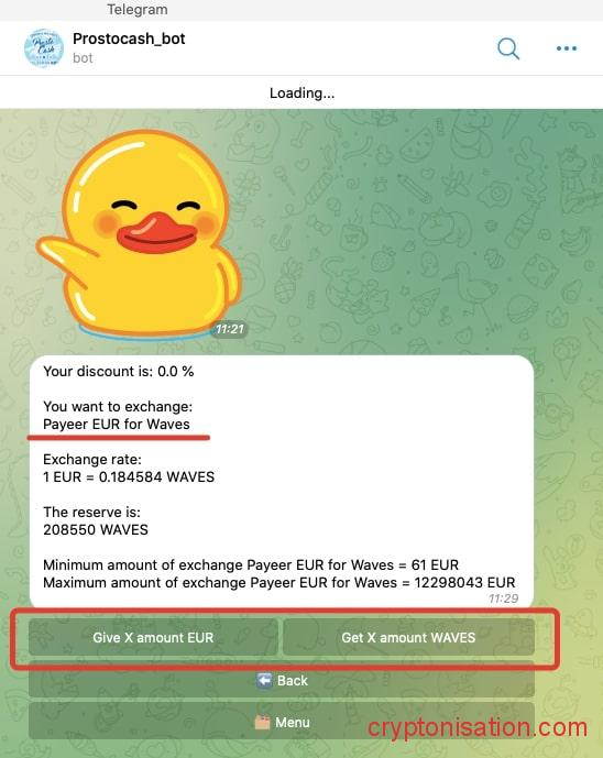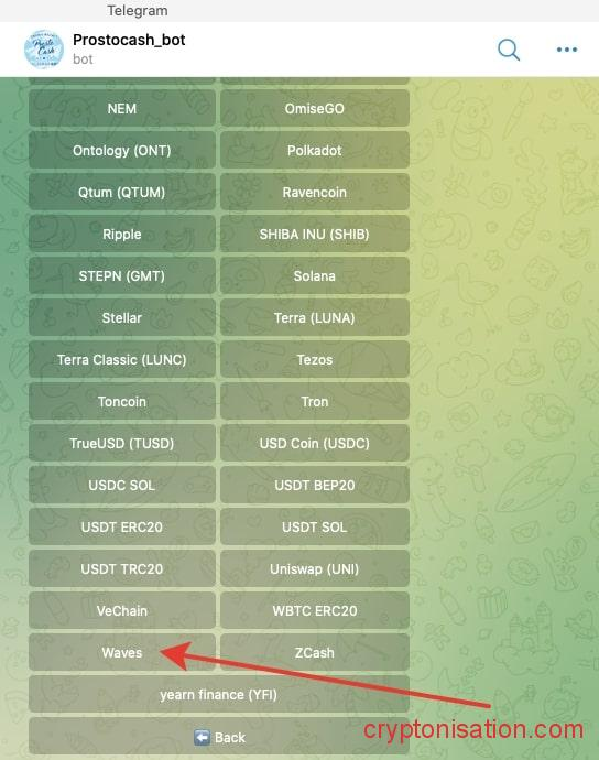 Купить криптовалюту VAWES можно также с помощью торговых ботов в Telegram. Популярный бот – @Prostocash_bot от обменника 👉 Prostocash. Чтобы купить WAVES с помощью бота: